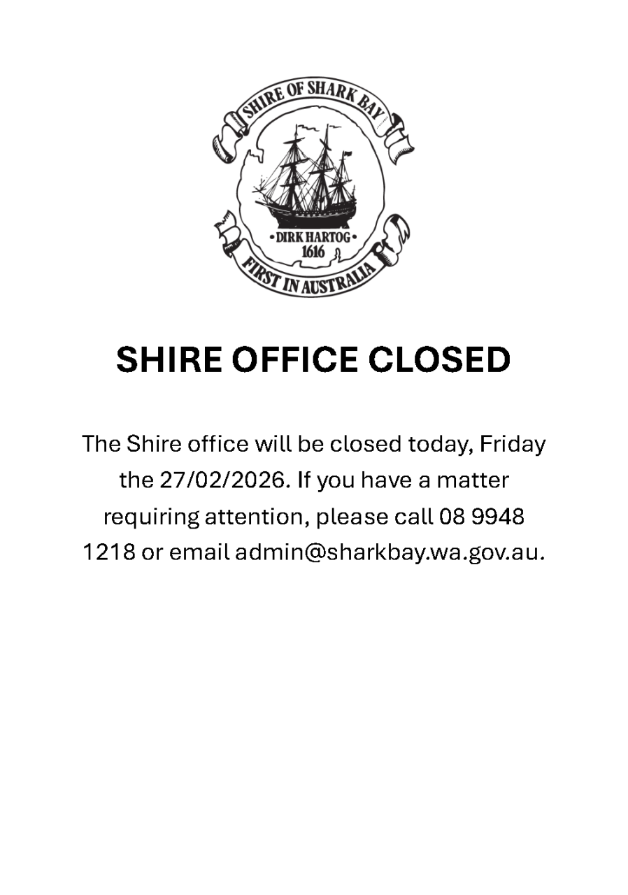 65 Knight Terrace Denham WA 6537 Email: admin@sharkbay.wa.gov.au Telephone: 08 9948 1218 Office hours 8:30AM – 4:00PM